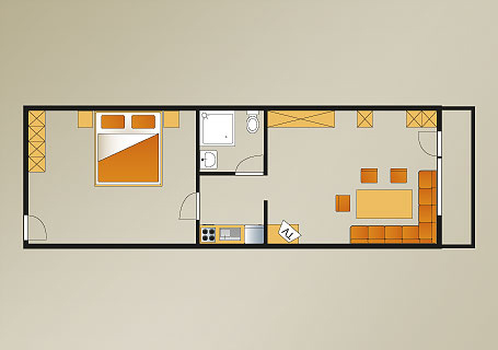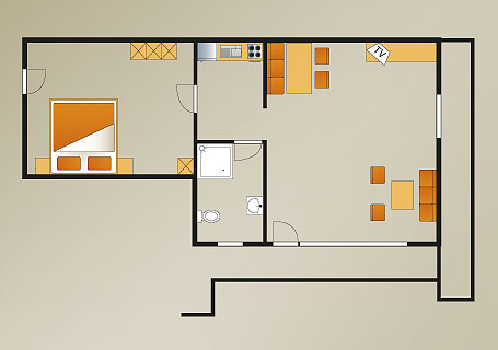 Diese Ferienwohnung mit 30m² für 2 Personen besteht aus einem Wohn-/Schlafraum mit Essbereich, Dusche/WC, einer kleinen Küchenzeile sowie einem Westbalkon mit tollem Bergblick.