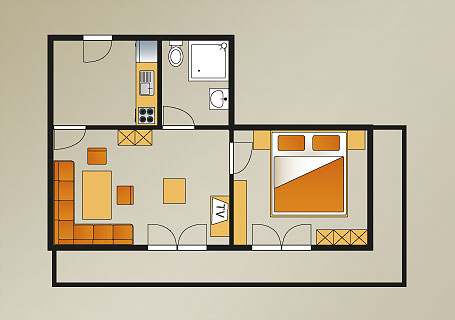 Diese Ferienwohnung mit 30m² für 2 Personen besteht aus einem Wohn-/Schlafraum mit Essbereich, Dusche/WC, einer kleinen Küchenzeile sowie einem Westbalkon mit tollem Bergblick.